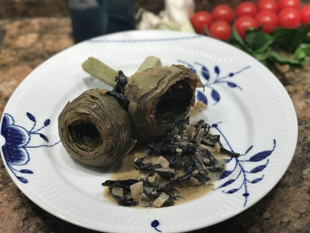 Efter en rejse i Rom med masser af god mad og masser af inspiration, ja så var det oplagt, at jeg skulle hjem at servere artiskokker – som jeg iøvrigt havde medbragt! – Men jeg ser der er fine artiskokker at få hos grønthandleren. Jeg har valgt at servere som grøn hovedret. Det smager fantastisk.