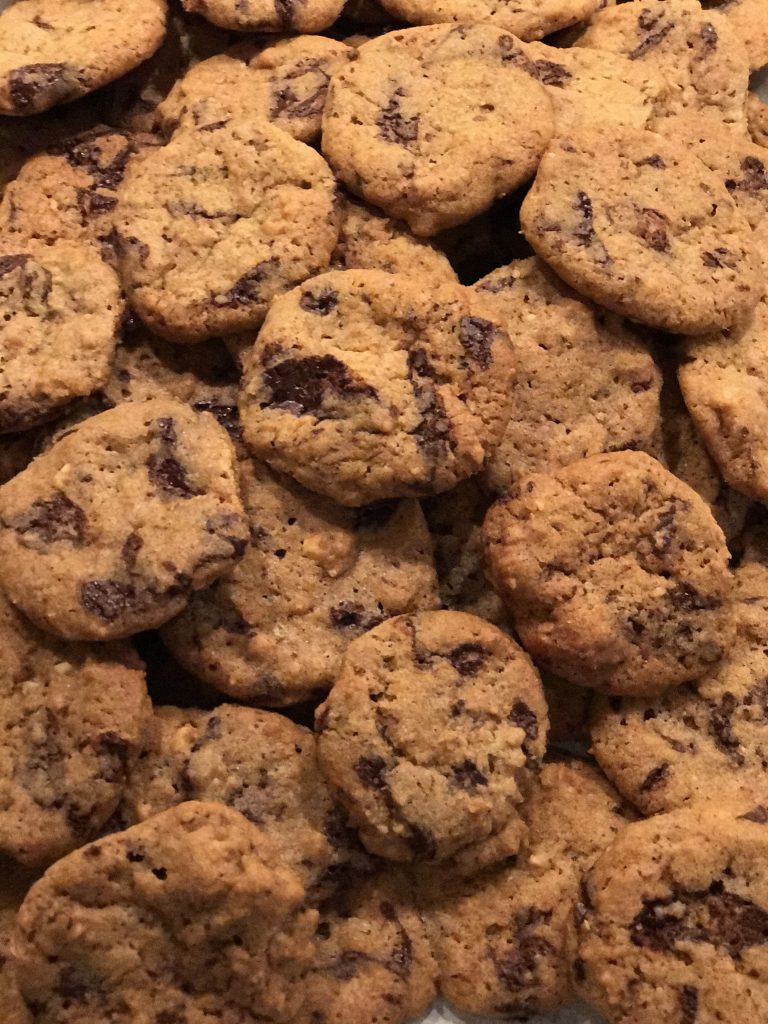 Smør piskes luftigt med de to slags sukker – æg tilsættes et af gangen og der piskes mellem hver. Mel blandes med natron og salt og røres i dejen – til sidst tilsættes det hakkede chokolade og de hakkede nøddekerner.