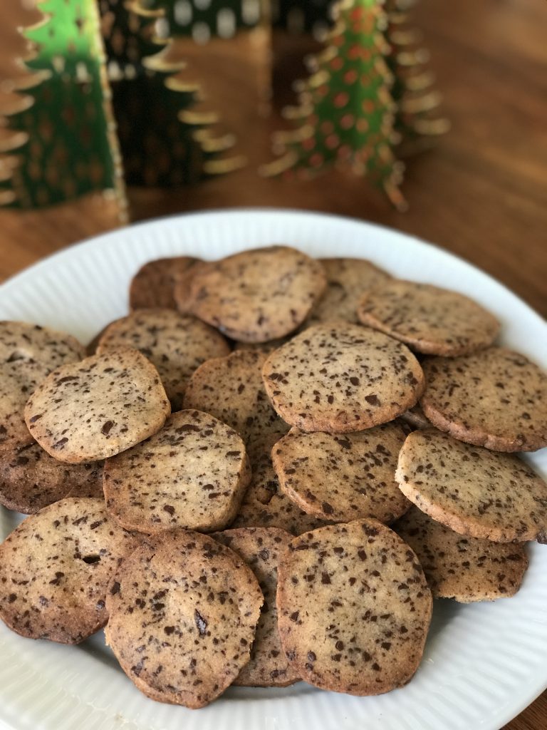 Ælt flormelis, smør skåret i tern og æg sammen. Tilsæt mel, finthakket chokolade, og appelsinskal. Del dejen i 4 stykker og rul hver klump til en ca. 25-30 lang rulle. Jeg pakker dem i film og kommer i fryser – tager så ud ca. 1/2-1 time før jeg skal bage – skær i 3-4 mm tynde skiver og læg på en bageplade beklædt med bagepapir. Bag ved 200 grader i ca. 10 min – tjek ved 8 min – de skal være gyldne i kanten. Afkøl og opbevar i tætlukket dåser.