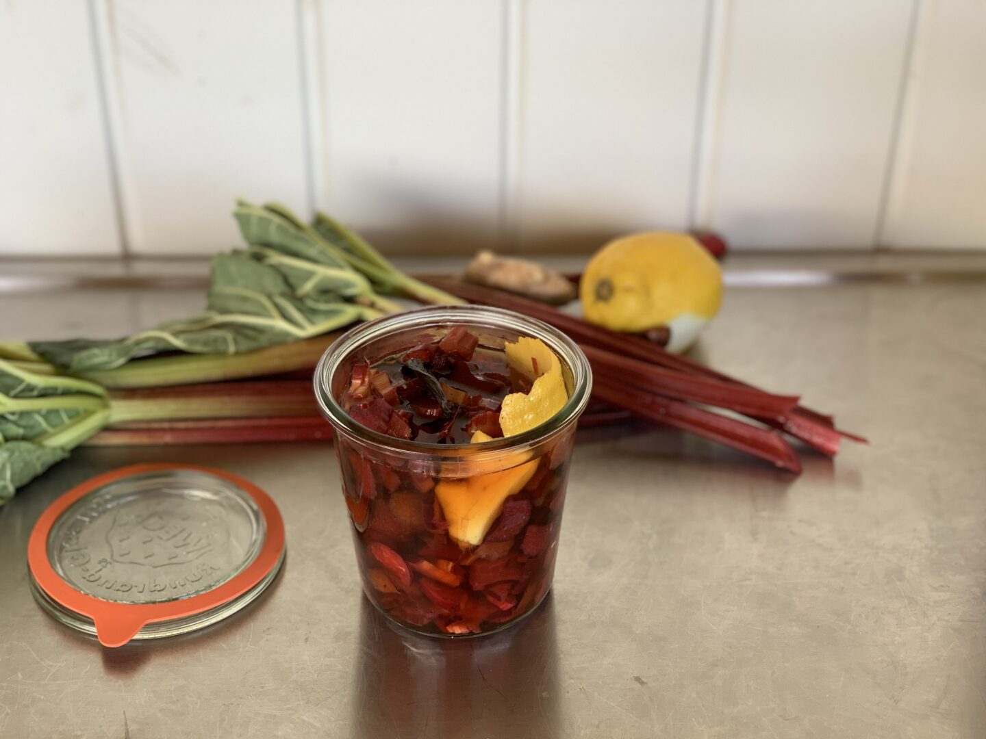 Kog en lage af de øvrige ingredienser, hæld lagen over rabarberne – jeg lader, vanilje, ingefær og citronskal blive i lagen.
