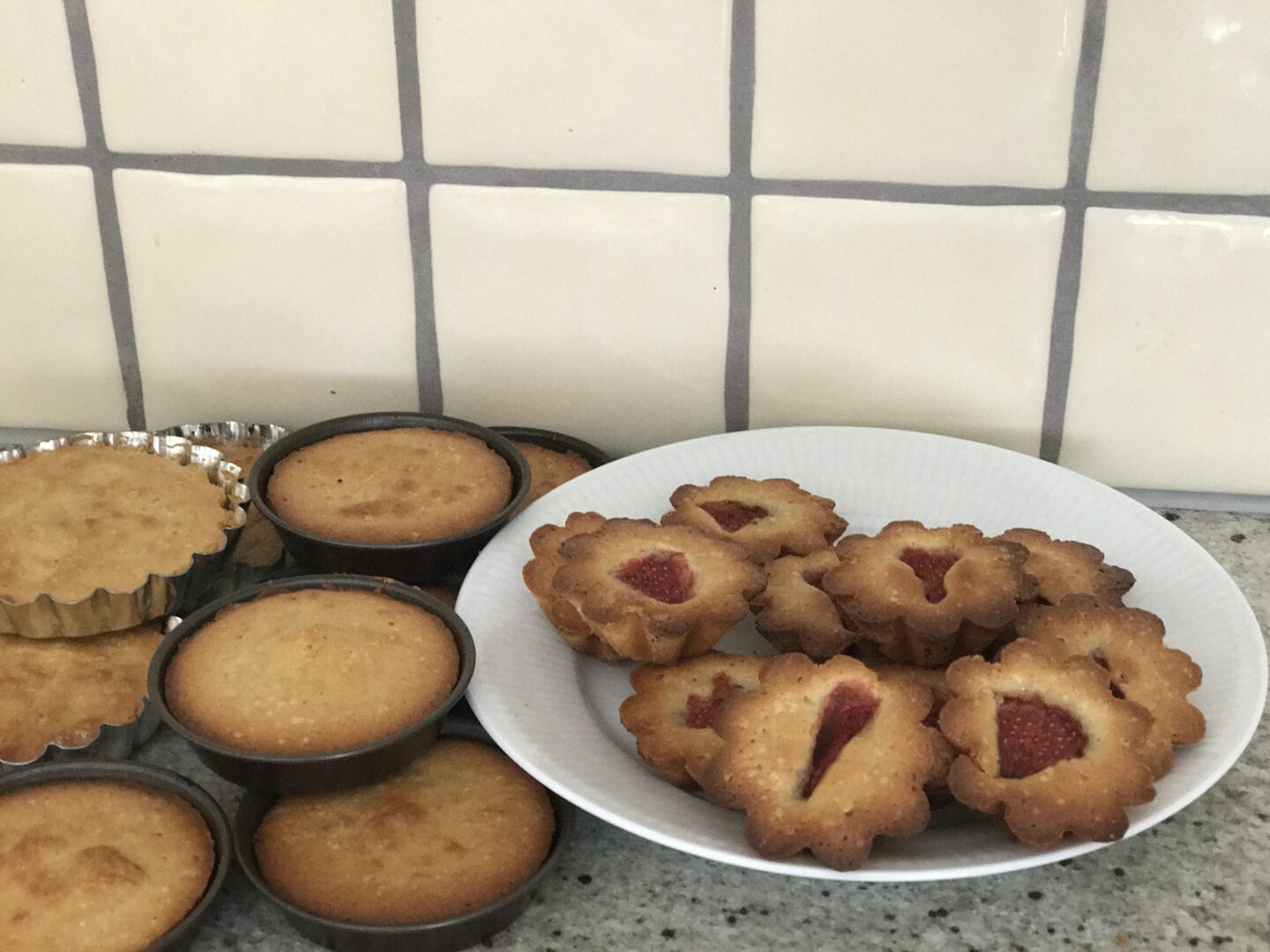 Marcipanen skal rives – gør det evt på foodprocessor – tilsæt så rørsukker og bland det med marcipan. Herefter tilsættes smør og der piskes så samtidig med at æggene tilsættes et ad gangen. Kornene fra vaniljestangen tilsættes sammen med mel. Smør de små forme – drys evt med lidt mel, så er du sikker på, at de ikke hænger fast. Fyld massen i forme – Du kan vælge, at komme et stykke jordbær eller et bær i midten af hver kage. Jeg bagte både nogen med og nogen uden, da jeg har tænkt, at bruge nogle til mini jordbærtærter. Kagerne bages ved 175 grader i ca. 15 min. Tjek efter 12 – bagetid afhænger lidt af størrelse og ovn. De skal være pænt lyse brune.