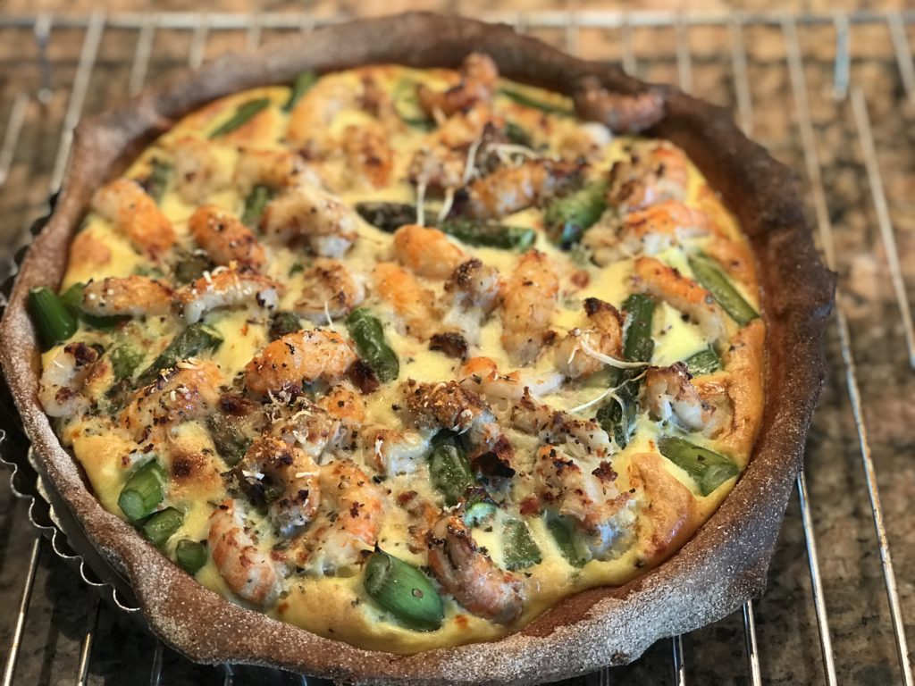 I den forbagte tærtebund lægges asparges og hummerhaler, hæld æggeblandingen over, drys evt med lidt reven parmesan. Bag tærten i ca. 45 min ved 175 grader. Jeg bager i en stål tærte form med løs bund – bagetid afhænger af hvilken form du anvender.