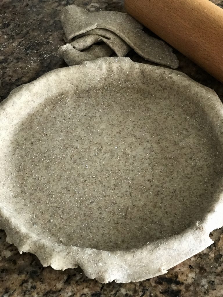 Du kan nemt bruge denne dej med det samme – du ruller ud på meldrysset bord – rul og vend og sørg for at der mel på bordet, så den ikke hænger i. Når dejen er stor nok til din form så – lidt større – så lægger du den i formen og presser forsigtig ned i kanterne – klip overskyende dej af – du kan vælge om du vil have dejen til kanten eller om der må være lidt ekstra. – Nogen vil foretrække en skarp kant – jeg kan godt lide man kan se lidt kant!!!