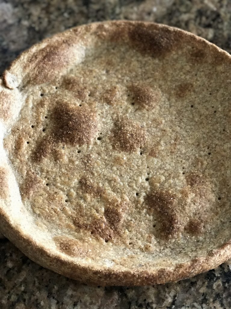 Prik huller i bunden og bag den i ca 15-20 min ved 200 g – til den er lysebrun – du kan hvis du er bekymret for at den buller for meget også lægge et stykke bagepapir på dejen med nogle kikærter for at holde den nede – jeg gør det aldrig – men jeg ved det anbefales af mange!!