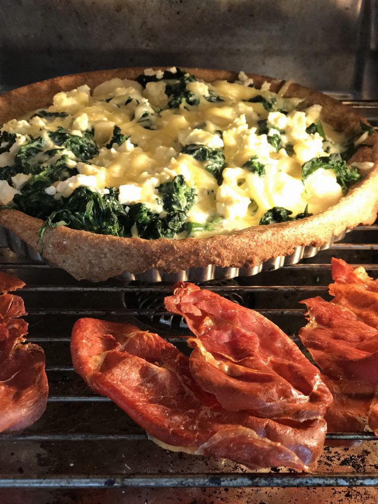 Fyld kunne være optøet ca. 100 g spinat, vredet og fordelt i bunden derefter 3 grønne asparges i skåret i stykker og så lidt små blomkålsbuketter – både asparges og blomkål havde fået et kort opkog. Jeg fordelte så lidt fetaost og til sidst æggemassen. Jeg pyntede med serano skinke som jeg havde tørret i ovnen og som tilbehør danske tomater!