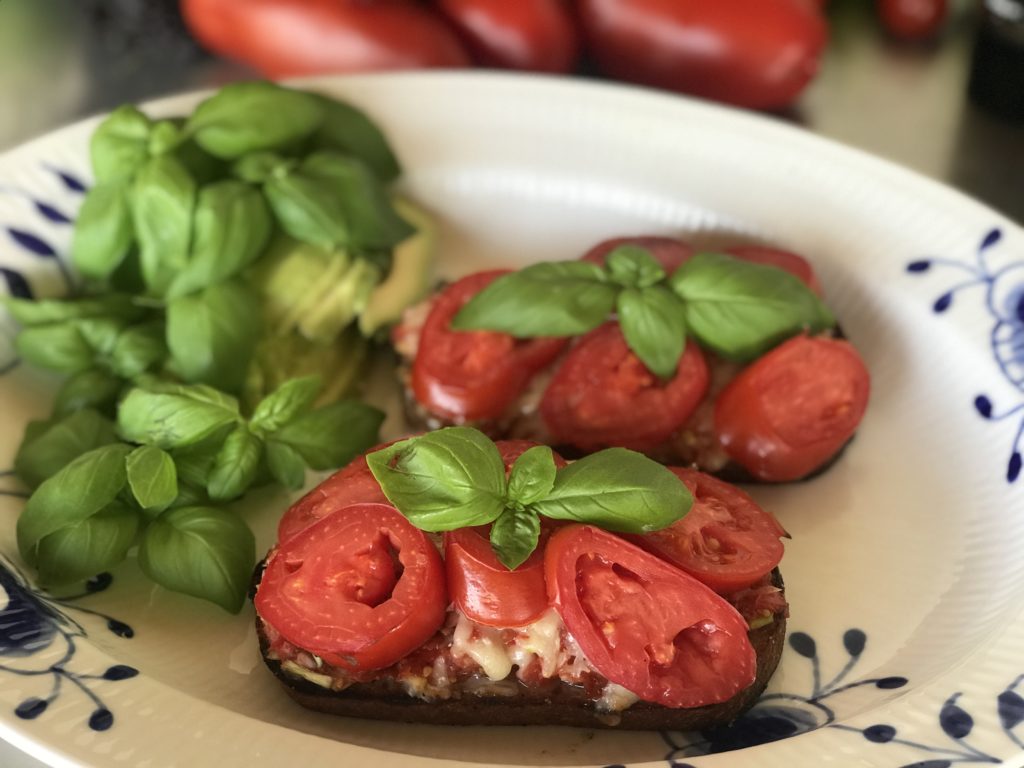På de varme sommerdage bliver det de lette måltider. Hvis man har gode solmodne tomater med smag, godt landbrød og basilikum, så kan man tilberede en tomat toast. Den kan spises som en vegetarret eller man kan pynte med lidt ristet bacon. Jeg valgte vegetarudgaven og som tilbehør kom der lidt avocado til. Jeg havde et landbrød som jeg havde bagt på vilgær (blomme) og med sigtet dalar hvede. Det skal blot være et brød der har lidt smag og fylde, så det kan gøre det ud for et måltid.